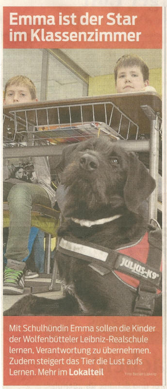 Die Ausbildung zum Schulhund absolvieren Emma und Klassenlehrerin Martina Fabian in Lüneburg. Mehr über Emma und das Projekt lesen Sie hier und im Zeitungsartikel.