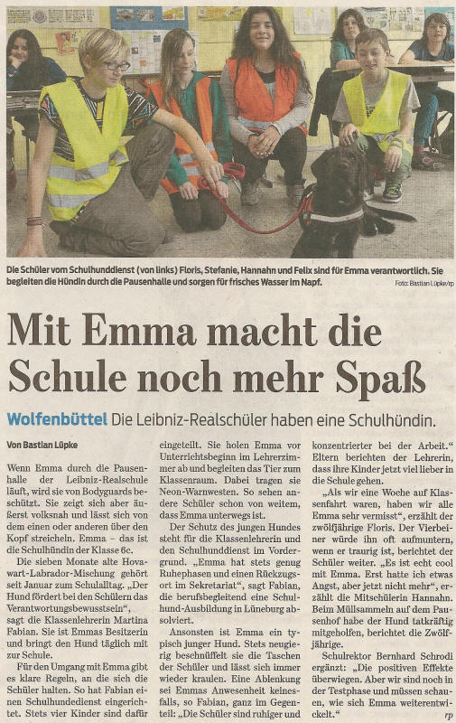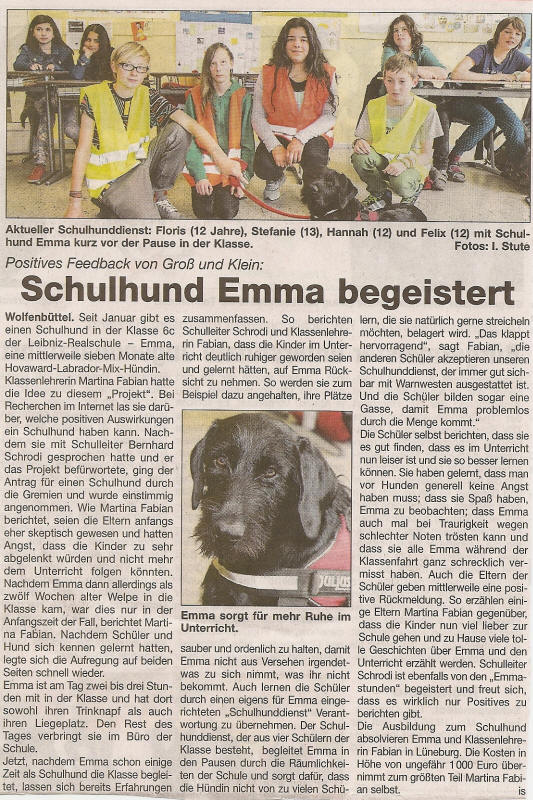 Seit Januar 2015 begeistert eine Hovaward-Labrador-Mix-Hündin namens Emma die Schülerinnen und Schüler der Klasse 6 c. Klassenlehrerin Martina Fabian hatte die Idee zu dem Projekt "Schulhund".