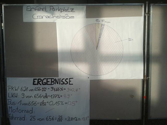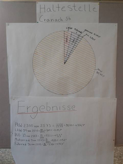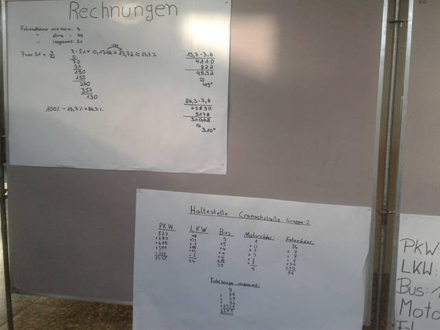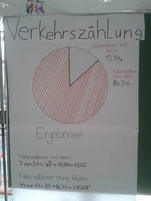 Die Klasse wurde in unterschiedliche Gruppen eingeteilt, die die Verkehrszählungen auswerteten. Zuerst haben die Gruppen die Ergebnisse ausgezählt und anschließend die verschiedenen prozentualen Anteile berechnet. Danach wurden die Prozente in Gradzahlen umgerechnet, um diese in einem Kreisdiagramm festzuhalten. Die Gruppen haben nach den Berechnungen ein Plakat erstellt, auf dem alle wichtigen Punkte dargestellt worden sind.